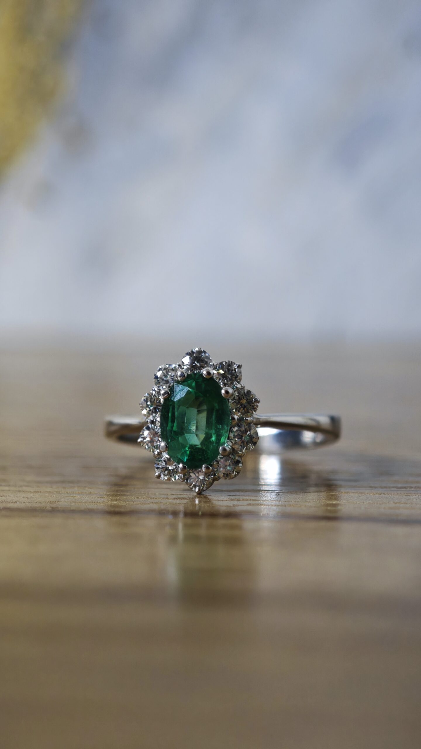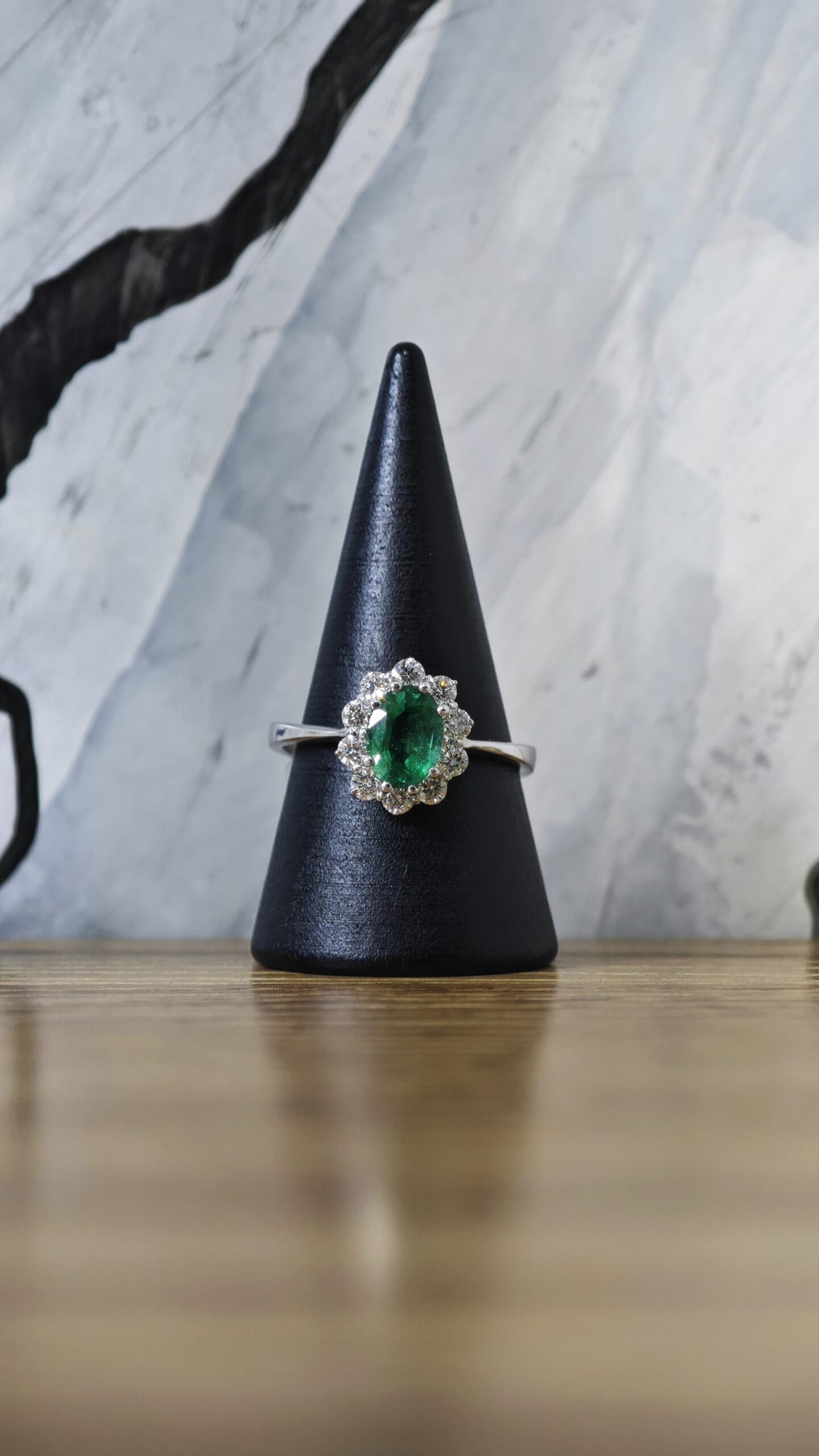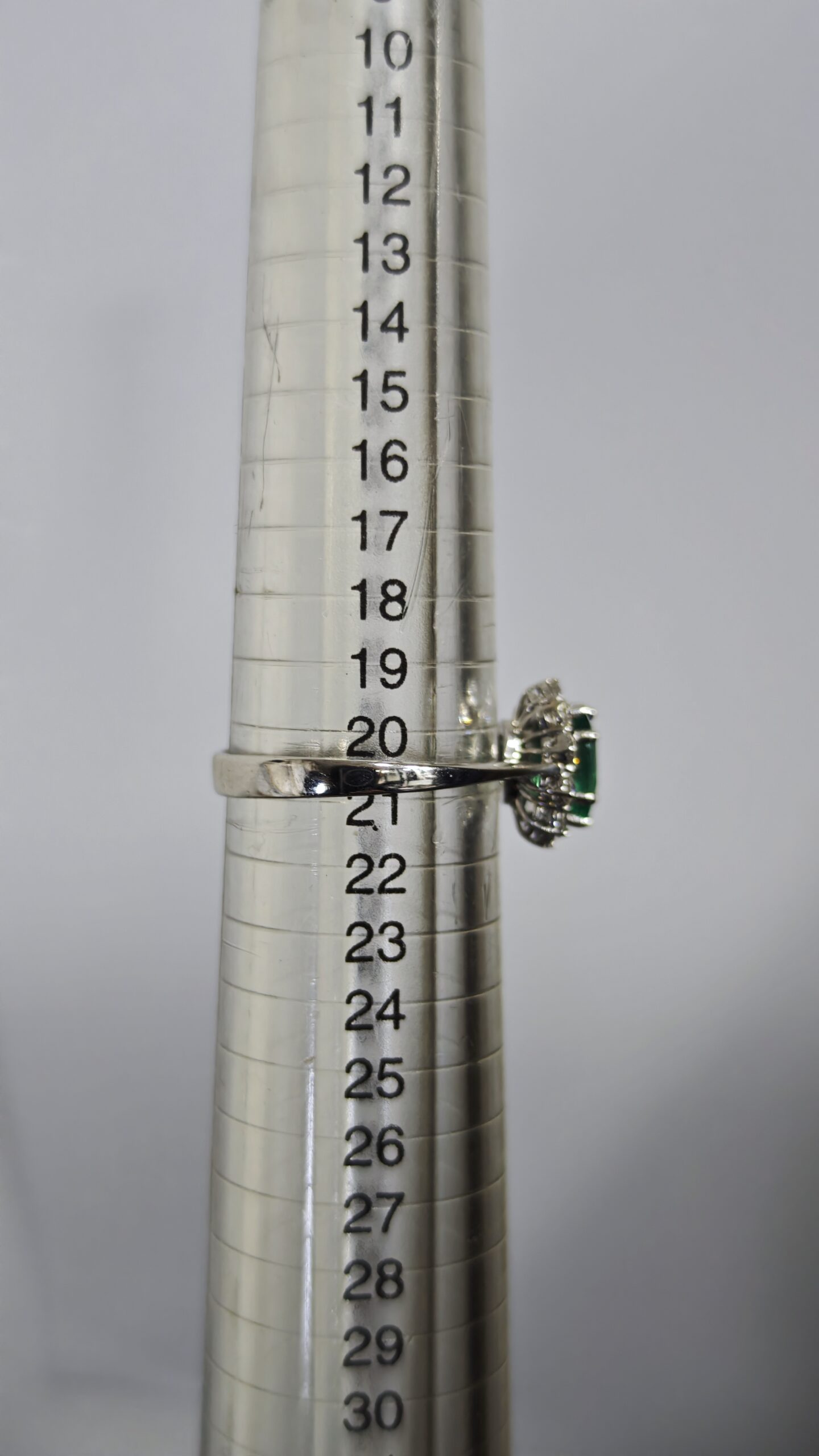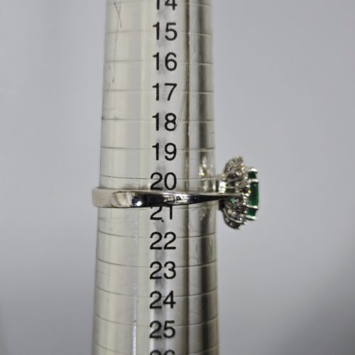 ANELLO IN ORO BIANCO 18 KT CON SMERALDO 1,20 CARATI, PROVENIENZA BRASILE CON PICCOLE TRACCE DI OLIO, DIAMANTI 0,70 CARATI TOTALI